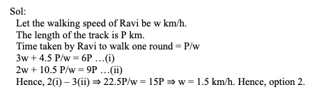 Q9. One day, Ravi walked along a circular track for 3 hours. He then ran along the track for a time duration which was same as the time taken to walk one complete circle. He covered a total of 6 P km. The next day, Ravi walked along the same track for 2 hours. He then cycled around the track for the time that he would take to walk one round. He covered a total of 9 P km. The length of the track is P km. If the speeds at which he ran and cycled were 4.5 km/h and 10.5 km/h, respectively, then find his walking speed (in km/h).