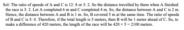 Q27. Three sprinters viz. A, B, and C participate in a race where A finishes the race first. All of them start running simultaneously with respective uniform speeds which they maintain till the end of the race. The distance between A and B was half the distance between A and C when A finishes the race. The speeds of A and C are 12 m/s and 8 m/s, respectively. Find the length of the race (in metres) if B finishes the race 420 metres ahead of C.