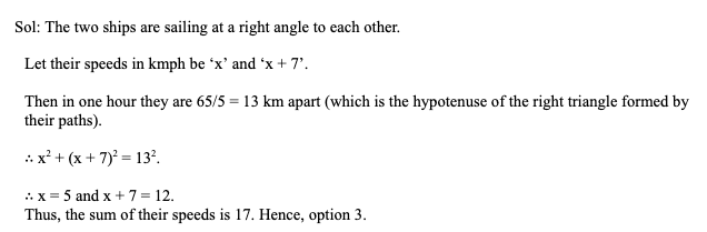Q28. Two ships start from the same port, one sailing due South-East and the other sailing due South-West, both travelling at constant speeds, the speed of the latter being 7 kmph greater than that of the former. If, after five hours, they are 65 km apart, then the sum of their speeds, in kmph is: