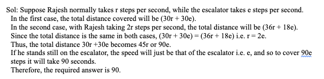 Q29. Rajesh takes 30 seconds to finish riding an escalator if he walks on it at his normal speed in the same direction. He takes 18 seconds to finish riding the escalator if he walks at twice his normal speed in the same direction. If Rajesh decides to stand still on the escalator, then the time, in seconds, needed to finish riding the escalator is: