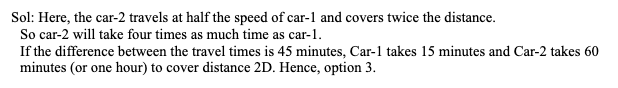 Q31. Car-1 travels distance ‘D’ with speed ‘2s’ whereas, Car-2 travels distance ‘2D’ with speed ‘s’. The difference between their travel times is 45 minutes. The time (in hour) taken by Car-2 to travel distance ‘2D’ is: