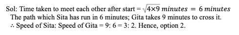 Q32. Sita and Gita start running simultaneously from two opposite ends of a straight path towards each other. After crossing each other, Sita and Gita reach their destinations in four and nine minutes, respectively. The ratio of speeds of Sita to that of Gita is: