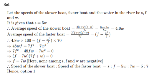 Q33. A river flows from point A to point B. Two boats- a fast boat and a slow boat complete the to and fro journey from point A to point B. The fast boat takes 30% less time to complete the entire journey than the slow boat. If the ratio of the speed of the slow boat in still water to that of the river current is 5: 1, find the ratio of the speed of the slow boat to that of the fast boat.