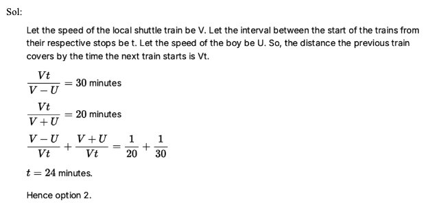 Q34. In a city, the local shuttle trains start from and arrive at the station at fixed intervals and run at a uniform speed. A boy was walking down the railway track at a constant speed. Every half an hour, a local train overtook him and every 20 minutes, a local train passed him in the opposite direction. Find the time interval between a local train passing a certain point on the railway track and the immediately next local train passing that point in the same direction.