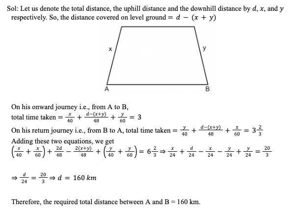 Q37. There are two cities – A and B – such that the road to travel between them is partly uphill, partly on level ground and partly downhill. It took three hours for a bus to go from A to B, whereas it took 40 minutes more for the same bus to come back from B to A. Find the distance (in km) between A and B, if the speed of the bus at uphill, downhill and that on the level ground are 40 km/hr, 60 km/hr and 48 km/hr respectively.