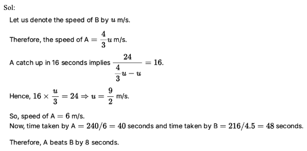 Q38. After giving B a head start of 24 m in a race of 240 m, A was able to catch up with B in 16 seconds. If the speed of A is 33 1/3% more than that of B, by how many seconds will A beat B in that race?