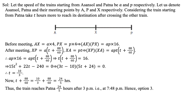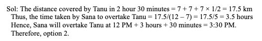 Q55. Tanu and Sana start from their homes at 9:30 AM and 12:00 PM respectively, in the same direction, to meet their other friends. Tanu moves at a speed of 7 km/h while Sana moves at the speed of 12 km/h. If Sana overtakes Tanu, then what time was it?