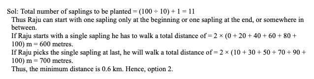 Q40. Raju has been asked to plant saplings on one side of a 100 metres long road from beginning to end with an interval of 10 metres stretch between two consecutive saplings. All the saplings have been stacked at one end of the road. Raju can carry two saplings at a time and has to return to the place where all the saplings are stacked to take another pair of saplings. Raju completes this job by walking the minimum distance possible and returns to the end of the road from where he started planting after finishing the job. How much distance (in kilometres) did he walk in this process?