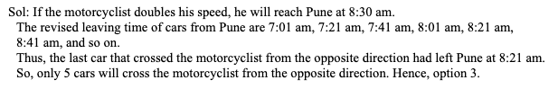 Q41. A motorcyclist leaves Mumbai at 7 am and reaches Pune at 10 am. Starting from 7:01 am, after every 10 minutes a car leaves Pune and moves towards Mumbai. These cars cross the motorcyclist on the road from the opposite side. How many cars will cross the motorcyclist from the opposite direction, if the motorcyclist doubles his speed and the interval between two consecutive cars’ leaving time is also doubled, keeping all other things the same as before?