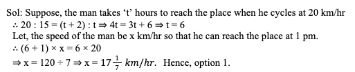 Q42. If a man cycles at 15 km/hr, then he arrives at a certain place at 2 p.m. If he cycles at 20 km/hr, he will arrive at the same place at 12 p.m. At what speed must he cycle to get there at 1 p.m.?