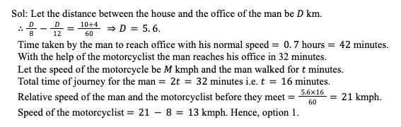 Q43. If a man walks at 8 kmph speed, he reaches his office 10 minutes later than the scheduled time. If he increases his speed by 4 kmph, he reaches his office 4 minutes earlier than the scheduled time. A motorcyclist, who starts from the office at the same time when the man starts from his house for the office at 8 kmph, meets him on the road and rides him to the office to reach the office just on scheduled time. Find the speed of the motorcycle in kmph. (The time taken by the man to ride the motorcycle and by the rider to turn it around is negligible.)