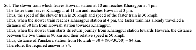 Q44. A train leaves Howrah station for Kharagpur at 10 am. Another train leaves Kharagpur station for Howrah at 11 am. The trains cross each other at Kolaghat station, which is equidistant from both Howrah and Kharagpur station, at 1 pm. Both the trains on reaching their destination stations immediately start their return journeys and meet for the second time at Panskura station. What is the distance between Howrah and Panskura station, in kilometres, given that the distance of Kharagpur from Howrah station is 120 km?