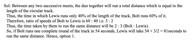 Q45. Two sprinters Lewis and Bolt are running on a circular track. They started simultaneously from the same position but ran in opposite directions. If they keep on running indefinitely with their respective uniform speeds, Bolt will always run 50% more distance than Lewis between any two successive meets. If Bolt completes one round of the track in 54 seconds, then find the time (in seconds) taken by Lewis to complete one round of the track.