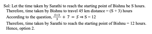 Q46. Bishnu and Sarathi start moving towards each other simultaneously from two opposite ends of a straight path which is 45 km long. Bishnu takes 3 hours more to reach the opposite end in comparison to Sarathi. If Sarathi reaches the starting point of Bishnu 7 hours after Bishnu moves one third of total distance, then, find the total time (in hours) taken by Sarathi to reach the starting point of Bishnu.