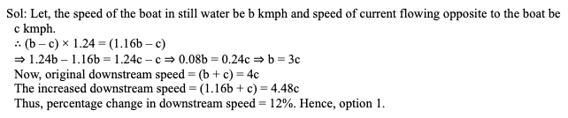 Q47. A boat is moving at a constant speed against the stream that also flows with a constant speed. If the speed of the boat is increased by 16%, its speed in the upstream increases by 24%. What will be the percentage change in the downstream speed of the boat, if its speed is similarly increased by 16%?
