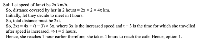 Q48. Janvi has to meet a friend in a cafe and is driving her car at a constant speed. After driving for 2 hours, she receives a call from a friend who asks her to reach the cafe 1 hour earlier than originally planned. To achieve this, Janvi increases her speed by 50% and reaches 1 hour before the decided time. What is the total time (in hours) taken by Janvi to reach the cafe?