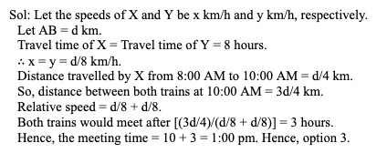 Q49. Train X started from town A towards town B at 8:00 AM and reached B at 4:00 PM. Train Y started from B towards A at 10:00 AM and reached B at 6:00 PM. At what time did both the trains meet each other?
