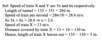 Q50. Two trains, X and Y, while traveling towards each other on different tracks, they enter a tunnel that is as long as the combined length of both trains. Train X is 135 meters long, and train Y is 151 meters long. After 10 seconds, the two trains meet inside the tunnel. If their speeds are in a ratio of 5:6, how much length (in m) of train X is still outside the tunnel when it meets train Y?
