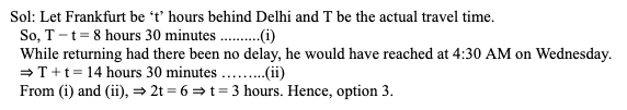 Q51. Vivek departs from Delhi for Frankfurt on Monday at 9 AM IST and arrives there on the same day at 5:30 PM local time. He departs from Frankfurt at 2 PM on Tuesday and takes the same route and reaches India on Wednesday morning at 6:30 AM after a 2 hour delay due to poor weather mid flight. What is the time difference (in hours) between the two cities?