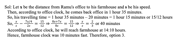 Q53. Ramu started from his office at 13:30 hours and drove to his farmhouse, arriving there when the farmhouse clock indicated 14:20 hours. After staying for 20 minutes, he drove back by a different route of length 7/4 times the first route at a rate twice as fast, reaching the office at 15:05 hours. As compared to the clock at the office, the farmhouse clock is: