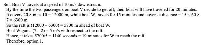Q54. Two motor boats, V and W, start from a point on a river and follow the same route. V travels downstream at 10 m/s, while W starts 5 minutes later at 7 m/s downstream. Fifteen minutes after W has started, two passengers on boat V decide that they need to join their family members on boat W. They are left behind on a raft that floats along the river to be picked up by boat W. If the speed of the river’s current is 2 m/s, find the time (in minutes) for which the passengers stayed on the raft.