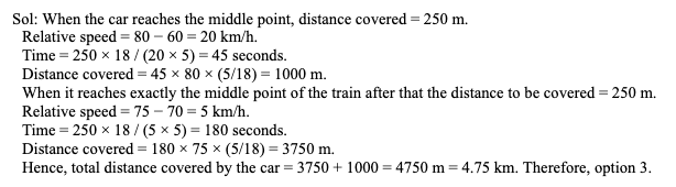 Q57. A 500-meter-long train is traveling at a speed of 60 km/h when it passes point A. At the same time when the train’s last carriage crosses point A, a car starts from point A with a speed of 80 km/h. When the car reaches the middle point of the train, the train increases its speed to 70 km/h and the car reduces its speed to 75 km/h. How much distance will the car travel (in km) while passing the train completely?