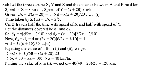 Q59. Three cars started simultaneously from town A to town B along the same highway. The second car traveled at a speed of 20 km/h more than that of the first car and reached town B one hour earlier than the first car. The third car arrived at town B thirty-six minutes earlier than the first car, traveling half the time with the speed of the first car and the other half at the speed of the second car. The distance (in km) between A and B is:
