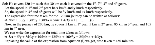Q62. Uday drives a bike having four gears such that its speed in the fourth gear is four times its speed in the first gear. The bike takes thrice the time to travel a certain distance in the second gear as compared to the third gear. In a 120 km journey, if Uday travels equal distances in each of the gears, he takes 540 minutes to complete the journey. In a 200 km journey the distances covered by him in the first, second and third gears are 5 km, 5 km and 85 km. If the remaining journey is covered in the 4th gear, then find the total time taken in minutes, to complete the journey.