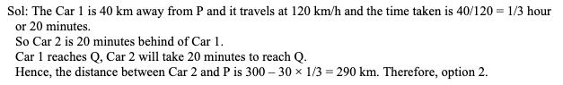 Q63. Points P and Q are 300 km apart. Cars 1 and 2 travel from P to Q, but Car 2 starts from P when Car 1 is already 40 km away from P. Each car travels at a speed of 120 km/h for the first 100 km, at 60 km/h for the next 100 km, and at 30 km/h for the last 100 km. What is the distance (in km) between Car 2 and P when Car 1 reaches Q?