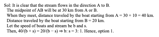 Q64. A boat starts from point A and moves towards B, while another boat starts from B and moves towards A at the same speed. The distance between the points A and B is 60 km. They meet at a point that is 10 km towards B from the midpoint of A and B. What is the ratio of the speed of the boat and stream respectively?