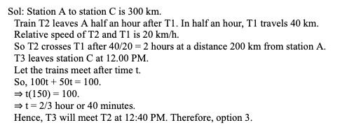 Q65. Train T1 departs from station A for station B at 9:30 AM, traveling at a speed of 80 km/h towards station C, which is situated 300 km away from A. Train T2 also departs from station A to station B at 10:00 AM, but it travels at a speed of 100 km/h. Just as T2 crosses T1, train T3, moving at 50 km/h, departs from station C towards station A. At what point in time will T3 meet T2?
