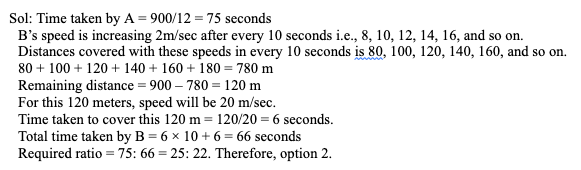 Q66. A and B are participating in a race. They both start from the same point and run in the same direction. A runs at a constant speed of 12 m/s, while B runs at a speed that increases by 2 m/s every 10 seconds. Initially, B’s speed is 8 m/s. If the race track is 900 meters long, then what is the ratio of the time taken by A and B to complete the race?