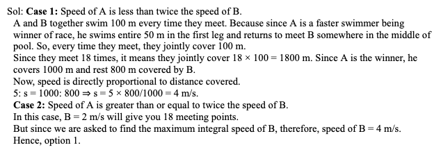 Q68. A and B start a race of 1000 m simultaneously from the same end of a swimming pool whose length is 50 m. A beats B and meets him exactly 18 times during the course of the race. If A’s speed is 5 m/s, then the maximum integral speed of B (in m/s) will be: