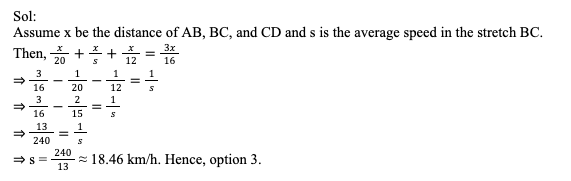 Q69. A person is travelling from A to D via B and C. The distances AB, BC, and CD are equal. The average speed on the stretch AB is 20 km/h and that over the stretch CD is 12 km/h. Which of the following is the interval in which average speed (in km/h) in the stretch BC is located if the average speed of the total journey was 16 km/h?