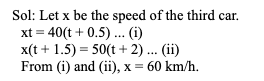 Q70. Two cars start from the same point simultaneously and in the same direction. The first car travels at 40 km/h and the second car at 50 km/h. A third car starts 30 minutes later from the same point and in the same direction. It overtakes the second car 1.5 hours after it overtook the first car. What is the speed (in km/h) of the third car?