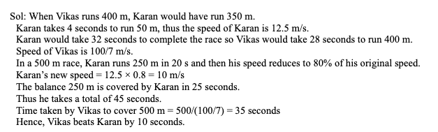 Q71. In a race of 400 m, Vikas beats Karan by 50 m or 4 seconds. If they start a race of 500 m simultaneously from the same point and if Karan after running 250 m reduces his speed to 80% of his usual speed, due to a niggle in his hamstring, then by how many seconds will Vikas beat Karan?