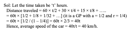 Q73. A car travels at 60 km/h for the first half time of the journey, at 30 km/h for the half of the remaining time of the journey, at 15 km/h for the half of the remaining time of the journey and so on until the car accomplishes its journey. The average speed (in km/h) of the car is equal to: