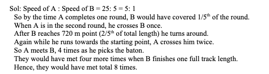 Q74. In a regular pentagonal track of length 1800 m, A and B both start simultaneously from the same vertex in the same direction. A runs at 25 m/s and B at 5 m/s. After covering 2/5th of the track, B realized that he forgot his baton and runs back to the starting point to pick the baton. When B finishes one full track length, how many times would they have met?