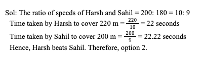 Q75. Harsh and Sahil run 200 metres, where Harsh beats Sahil by 20 metres. To do a favour to Sahil, Harsh starts 20 meters behind the starting line in the second 200 race. If they both run at their previous speed, then which of the following statements is true for the second race?