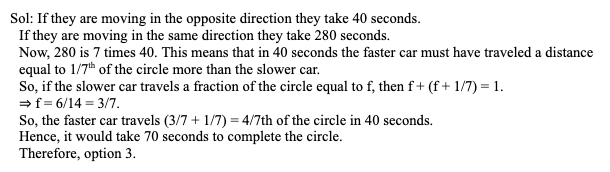 Q76. Two cars race around a circular track at constant speeds starting from the same point. If they travel in opposite directions, then they meet every 40 seconds. If they travel in the same direction, then they meet every 4 minutes 40 seconds. How long (in seconds) would the faster car take to complete one round of the circular track?