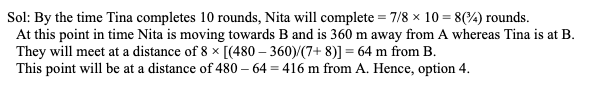Q77. A and B are the two opposite ends of a swimming pool and the distance between them is 480 m. Nita and Tina start swimming towards each other at the same time from A and B, with speeds in the ratio 7: 8 respectively. As soon as any of them reaches an end, she turns back and starts swimming towards the other end. At what distance (in m) from A will they meet when Tina is in her 11th round? Note: A to B is considered one round and B to A another round.