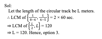 Q79. Lata, Asha, and Usha are running around a circular track starting simultaneously from the same point in the same direction with uniform speeds. Lata runs at a speed of 8 m/s, Asha runs at a speed of 6 m/s, and Usha runs at a speed of 5 m/s. Three of them meet together after 2 minutes for the first time after they have started running. What is the length of the circular track (in meters)?