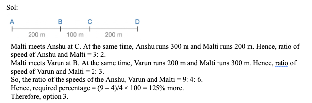 Q80. Points A, B, C and D lie on the same straight line such that B, C and D are 200 m, 300 m and 500 m away from A respectively. Anshu and Varun leave A at the same time and run towards D. Simultaneously; Malti leaves D and runs towards A. Malti meet Anshu at C, and Varun at B. If each person is running in uniform speed, then the speed of the fastest person is what percent more than that of the slowest person?