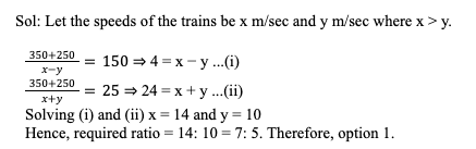 Q81. Two trains X and Y have lengths of 350 m and 250 m. When they run in the same direction, the faster train takes 150 seconds to cross the slower train. When they run in opposite directions, they take 25 seconds to cross each other. Find the ratio of the speeds of the trains X and Y respectively.
