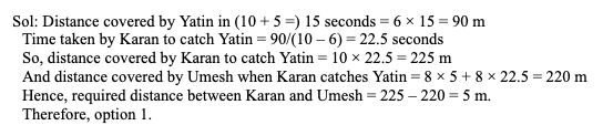 Q82. There are three runners Yatin, Umesh and Karan at the same point. Yatin starts running at a speed of 6 m/s from a point. After 10 seconds, Umesh starts running behind Yatin at a speed of 8 m/s. After 5 more seconds, Karan also starts running behind Umesh at a speed of 10 m/s. What is the distance (in m) between Karan and Umesh when Karan catches Yatin if all of them are running along a straight line?
