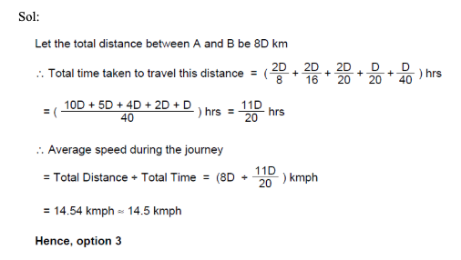 Q84. A cyclist rode from point A to point B. His speed was 8 kmph, 16 kmph and 20 kmph during the first quarter, the second quarter and the third quarter of the total distance. In the last quarter of the distance, he rode half the distance at 20 kmph and the remaining half the distance at 40 kmph. The average speed of the cyclist over this journey was closest to: