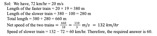 Q85. Train ‘A’ crosses Train ‘B’ running in the opposite direction in 18 seconds. The faster train crosses a pole in 19 seconds and it is running at 72 km/hr. The slower train is 100 m shorter than the faster train. What is the speed, in km/hr, of the slower train?