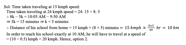 Q86. Niteesh leaves for his school from home every day at the same time. If he travels at a speed of 15 kmph he reaches his school at 10:05 AM and if he travels at a speed of 24 kmph he reaches his school at 9:50 AM. At what speed should he travel, if he wants to leave home at 9:30 AM and reach his school exactly at 10 AM?