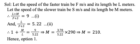 Q87. Two trains cross each other in 9 seconds when running in opposite directions along parallel lines. The driver of the slower train crosses the faster train in 5.22 seconds during the same crossing. If the faster train is 290 m long then the length of the slower train, in m, is: