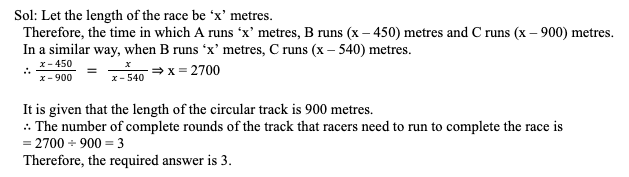 Q88. Three men A, B and C are running on a circular track in a race in which the person who completes ‘N’ rounds first wins the race. In the race, A beats B by 450 metres and C by 900 metres. Similarly, B beats C by 540 metres. If the length of the circular track is 900 metres, then the value of N is: